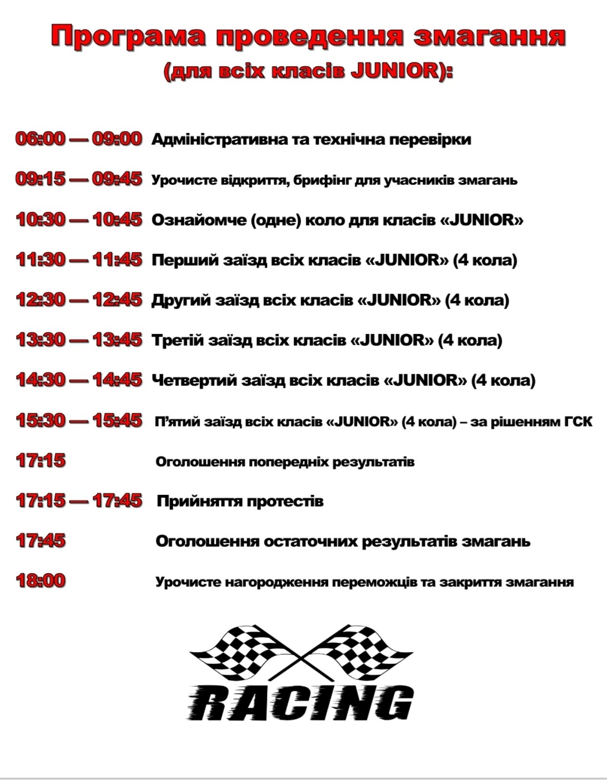 Увага! Заїзди в класі JUNIOR відбудуться за умови наявності 6 и більше учасників!